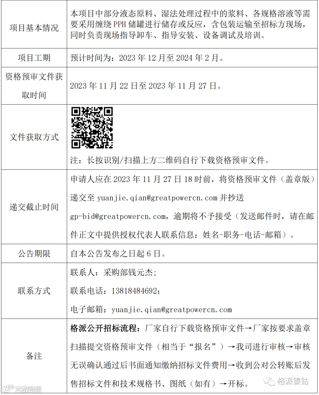 我司缠绕式PPH储罐设备项目已具备条件现进行公开招标,特邀请有意向的潜在投标人提出资格预审预审申请。