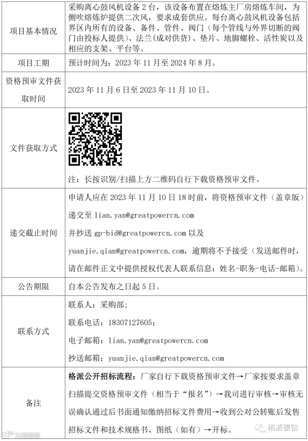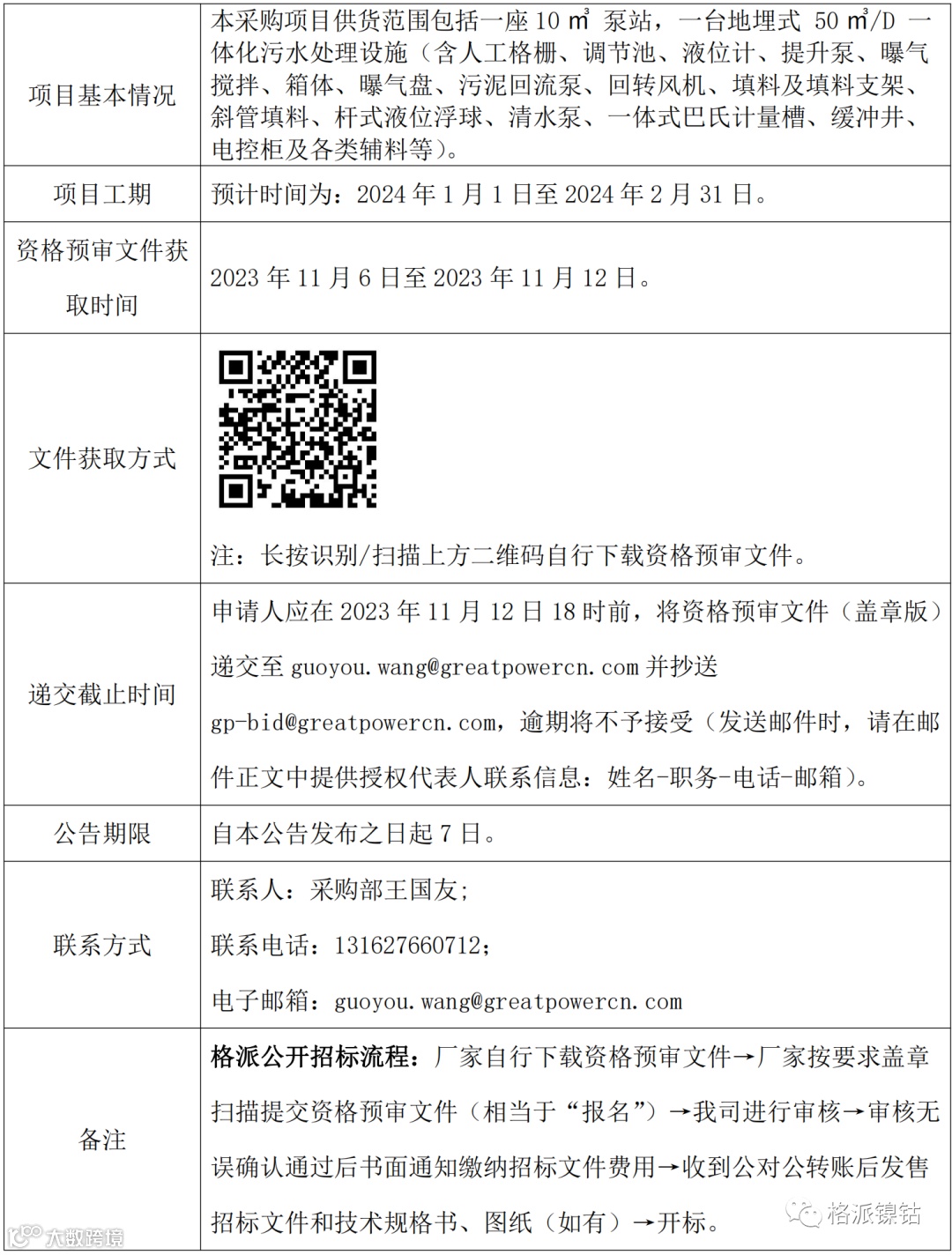 【格派招标公告】离心鼓风机、MHP搅拌装置、生活污水一体化处置设备项目