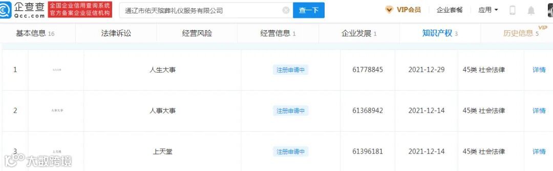 该公司商标申请数量只有三件,除了上述提到的两件45类“人生大事”商标之外,还于去年12月14日申请了一件“上天堂”商标,国际分类与另外两件商标相同。