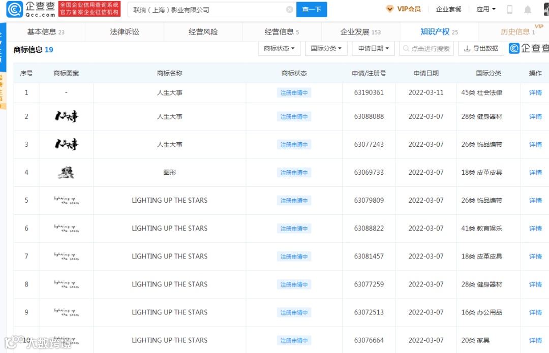 据企查查资料显示,联瑞影业公司已于2021年5月对《人生大事》剧本进行作品著作权登记。此外,联瑞影业公司还申请了九件电影相关图形商标,分别为“人生大事”及“lighting up the stars”的艺术设计字体图案,国际分类涉及16类办公用品、18类皮革皮具、20类家具、21类日用器具、25类服装鞋帽、26类饰品编带、28类健身器材、35类广告销售,九件图形商标的申请时间均为2022年3月7日。此外联瑞影业公司并没有提交其他电影《人生大事》相关的文字商标注册申请,且已申请商标也并未进行全类别保护。