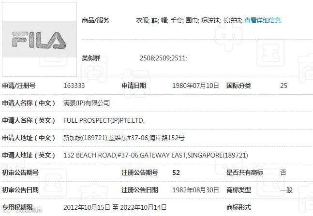 于中国商标网查询结果显示,第163333号“FILA”商标是满景(IP)有限公司于1980年申请注册的,被核准使用在“衣服;鞋;帽;手套”等第25类商品及服务上。后经授权,取得“FILA”系列商标在中国的唯一合法使用权。