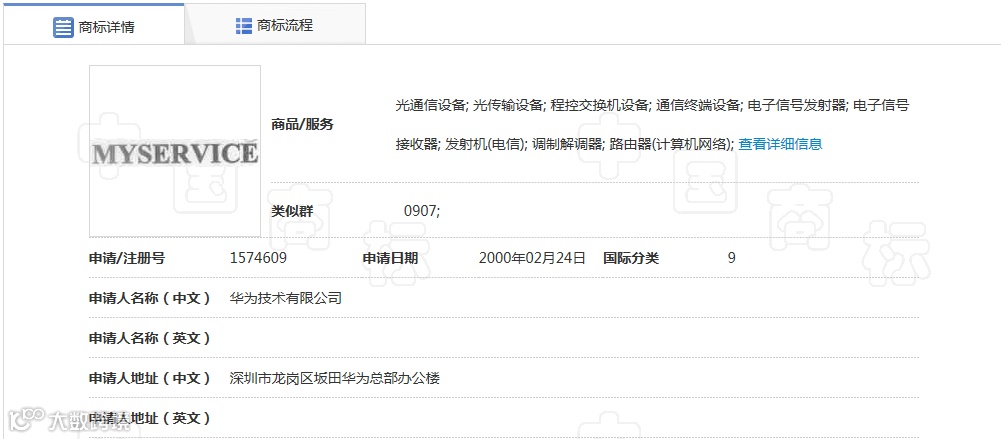 华为在2000年2月24日在第9类上申请注册了第1574609号“MyService”商标(引证商标),核准使用在“光通信设备;光传输设备;程控交换机设备”等商品上。