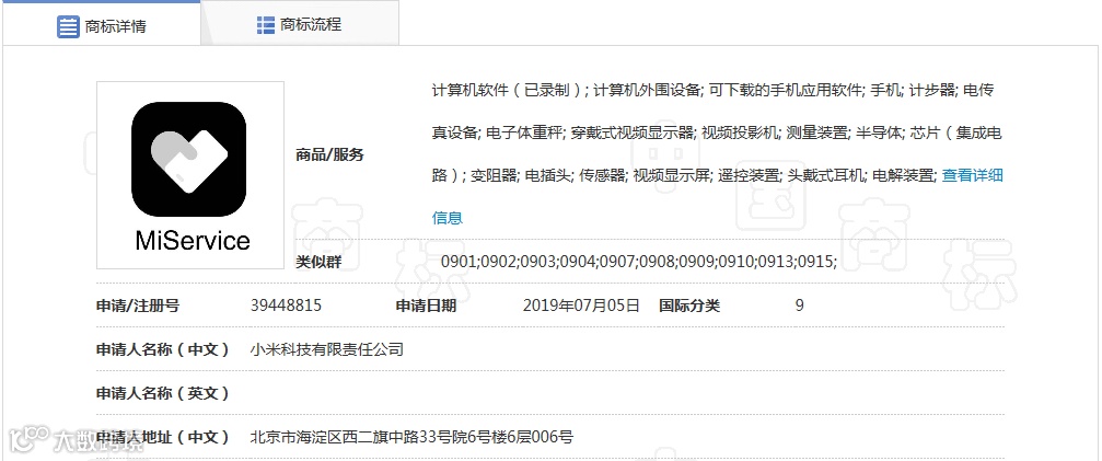 2019年7月5日,小米在第9类上申请注册了第39448815号“MiService”商标(诉争商标),国际分类涉及计算机软件(已录制);计算机外围设备;手机等。