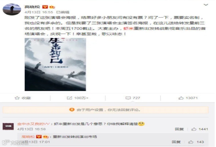 值得一提的是,高晓松曾于今年4月发布微博称,虾米已重新出发转战演出市场“生来知己——《山河令》主题演唱会”为虾米转战影视音乐出品的首场演唱会。