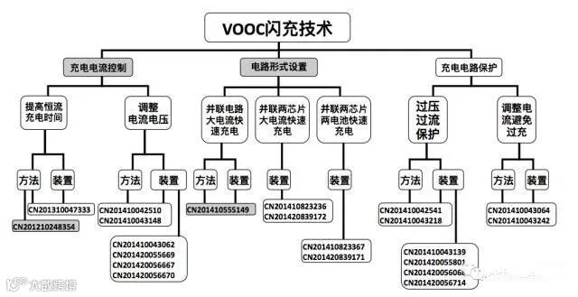图2所示为OPPO在VOOC闪充技术方面截止2016年3月公开的专利分布情况,分别涉及闪充技术的充电电流控制、电路形式设置以及充电电路保护等技术分支。