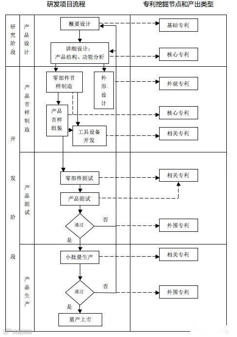 (2)贯穿研发项目始终。由于企业研发项目具有系统性的特点,在其所涉及的每一个环节、每一个方面都应该是基于研发项目的专利挖掘手段应当关注的重点。贯穿研发项目始终的专利挖掘节点和专利产出类型如图1所示。