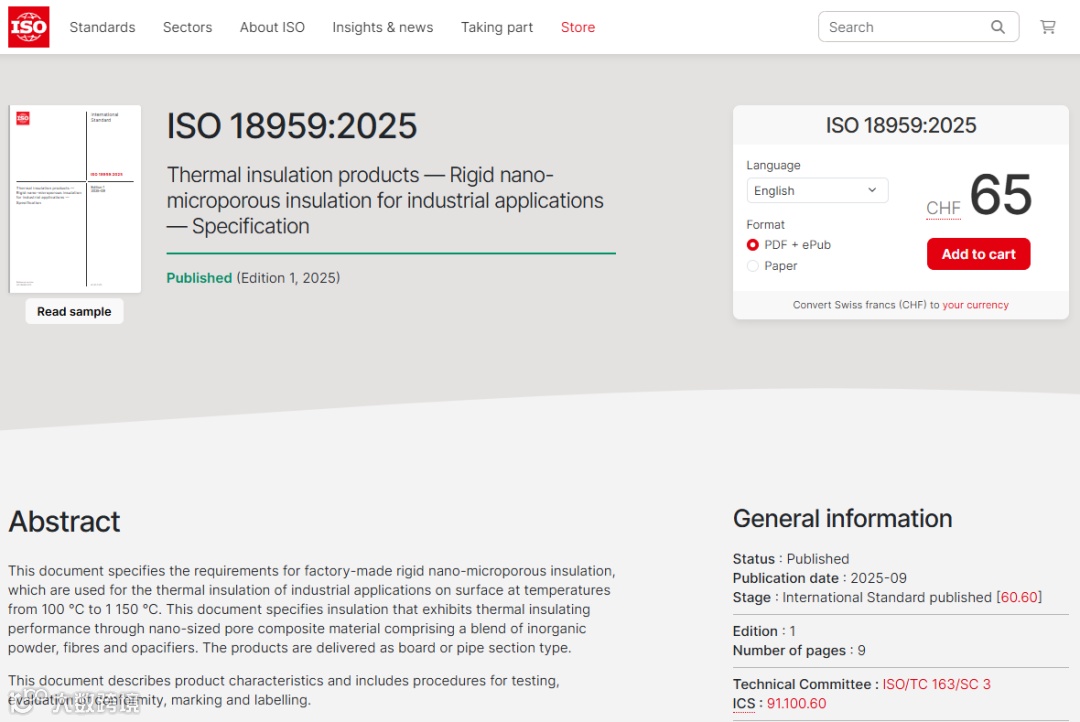 由南京玻璃纤维研究设计院有限公司牵头、广州晖能新材料有限公司等单位参与制定的国际标准ISO 18959:2025 Thermal insulation products — Rigid nano-microporous insulation for industrial applications — Specification(中文名称:绝热材料 工业用硬质纳米微孔制品规范),由ISO组织正式发布。该标准的发布在全球范围内统一了纳米微孔板等硬质纳米微孔制品的定义和分类,明确了产品性能指标及测试方法,为相关国际贸易提供有效的技术支撑,进一步提升了我国纳米微孔材料产业的国际影响力。