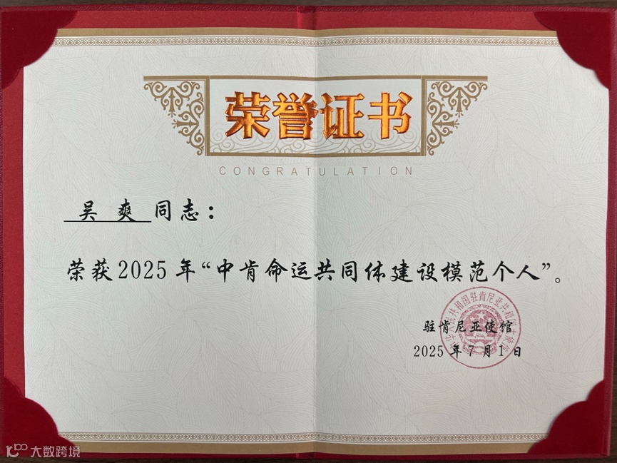 中材国际员工荣获中国驻肯尼亚大使馆“中肯命运共同体建设模范个人”称号