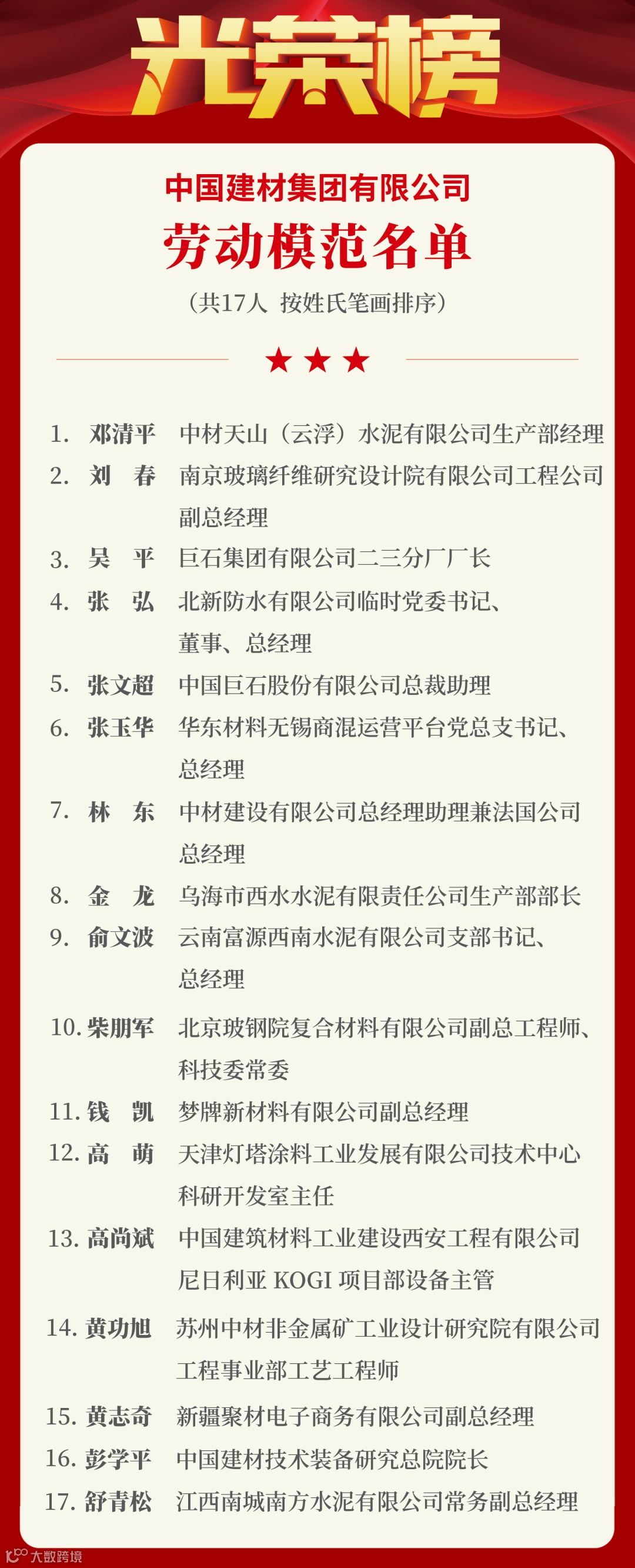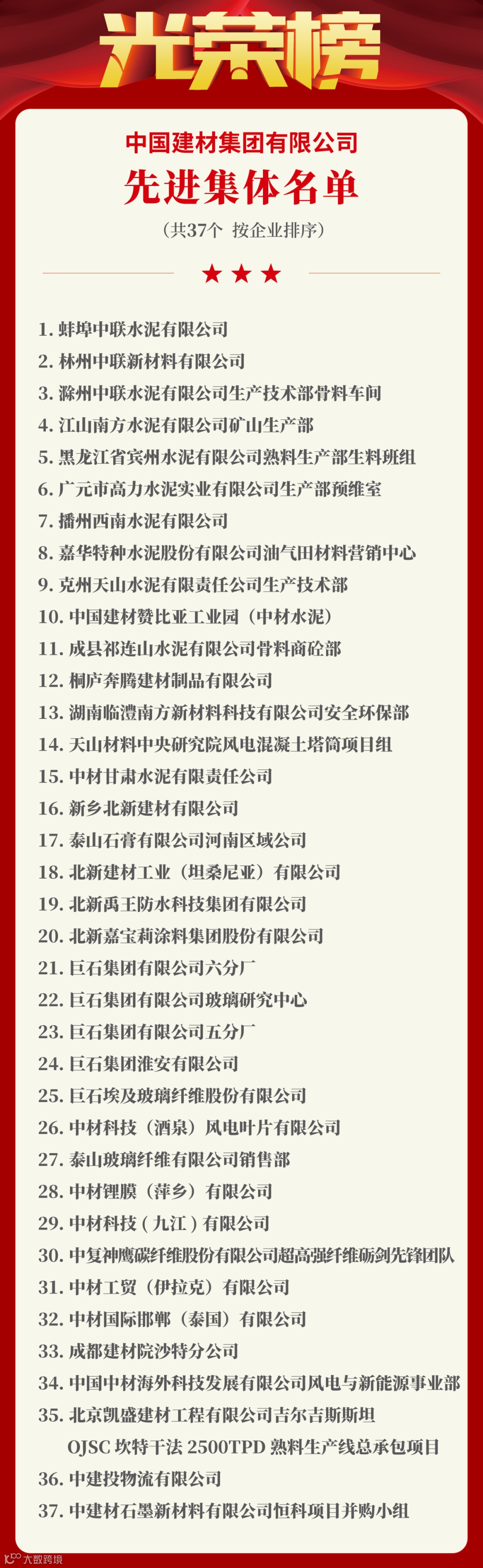 此外,5名个人、1个集体荣获省部级表彰;17名个人、37个集体荣获中国建材集团表彰。