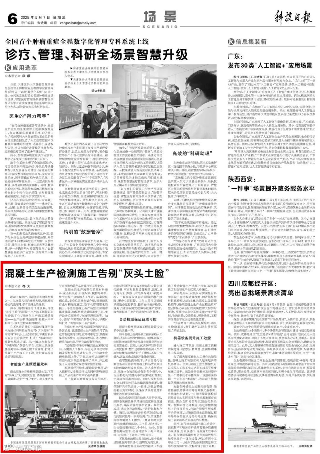 在不久前召开的中国建材集团所属南方新材料科技有限公司(以下简称“华南材料”)年会上,记者看到,华南材料从实际应用场景出发,打造出“华南智砼”数智化解决方案。这一解决方案包括“华南智砼”数智化平台、混凝土抗压强度检测设备、混凝土施工设备等,打通了混凝土生产施工上下游,为行业实现全场景智慧赋能。