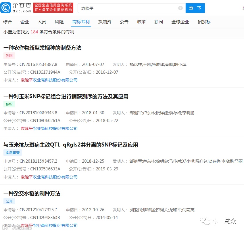 据企查查APP显示,有关袁隆平院士相关的专利信息高达184条,其中包含一种基于KASP技术水稻抗稻瘟病基因标记体系及其应用、一种提高水稻稻瘟病抗性的方法等。