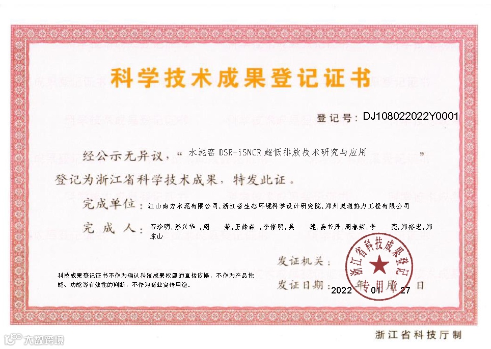 获得多项发明专利授权,“水泥泥窑DSR-iSNCR超低排放技术研究与应用”项目荣获浙江省科学技术成果,并有多家所属公司通过高新企业评审;