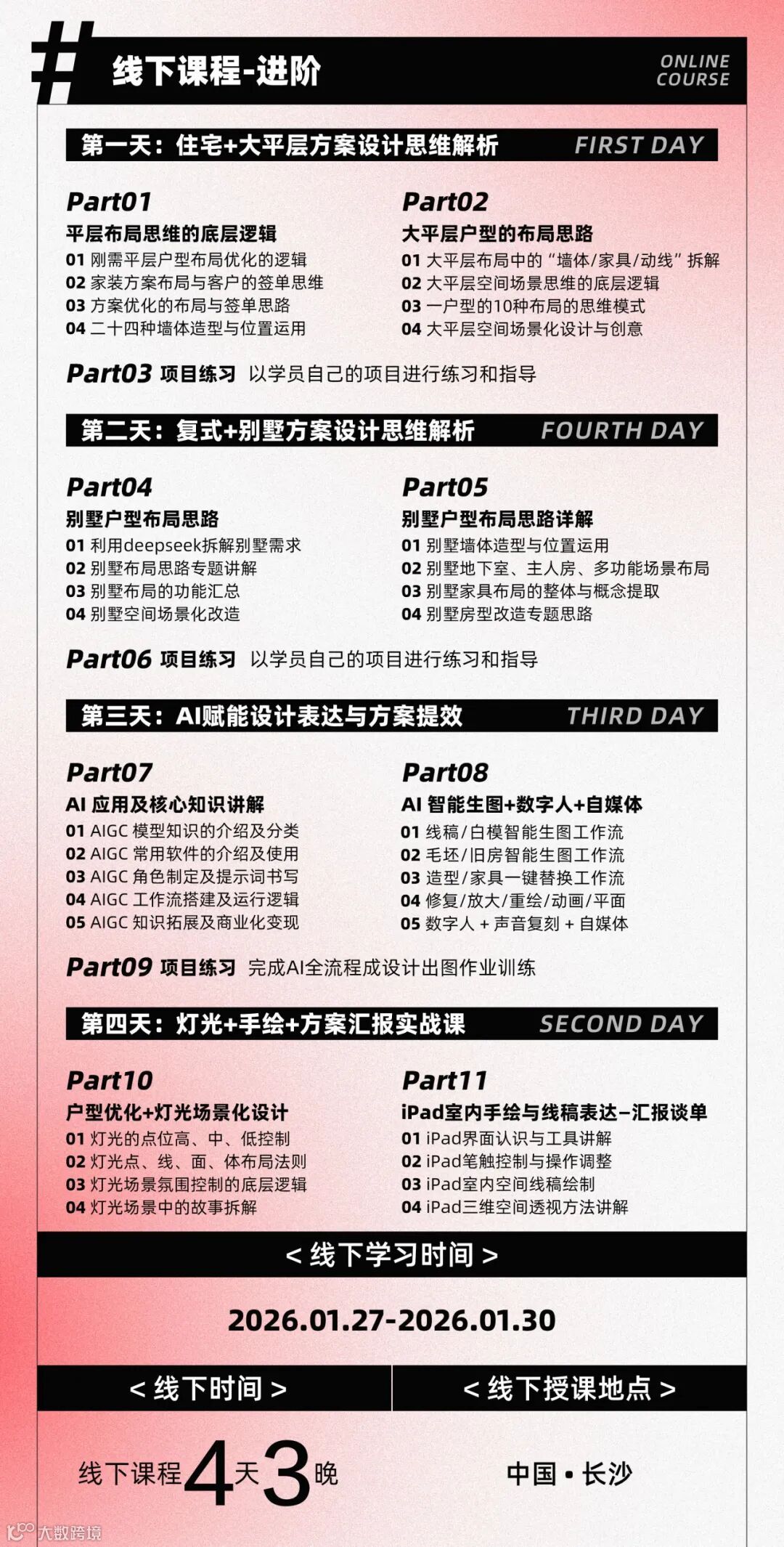 别让这些难题困住你的设计之路!2026年1月27日,三哥新一期方案线下实战课即将在长沙开讲,4天3晚沉浸式学习,从住宅到大平层、从复式到别墅全户型覆盖,再加上AI设计赋能、灯光设计与手绘汇报实战,全方位打通你的设计痛点,让方案能力和签单效率双向提升!