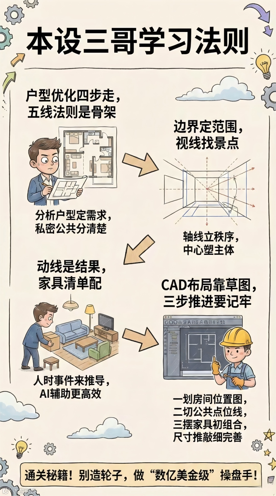 课程开篇即测试摸底,快速帮学员进入紧张有序的学习状态。九天的学练之旅从基础筑牢开始,每日都有明确的学习目标与实操任务:前期聚焦户型优化核心基础,通过“五线法则”、家具清单制定、CAD布局落地、草图绘制等核心方法的讲解与同步实操,为后续进阶筑牢根基。