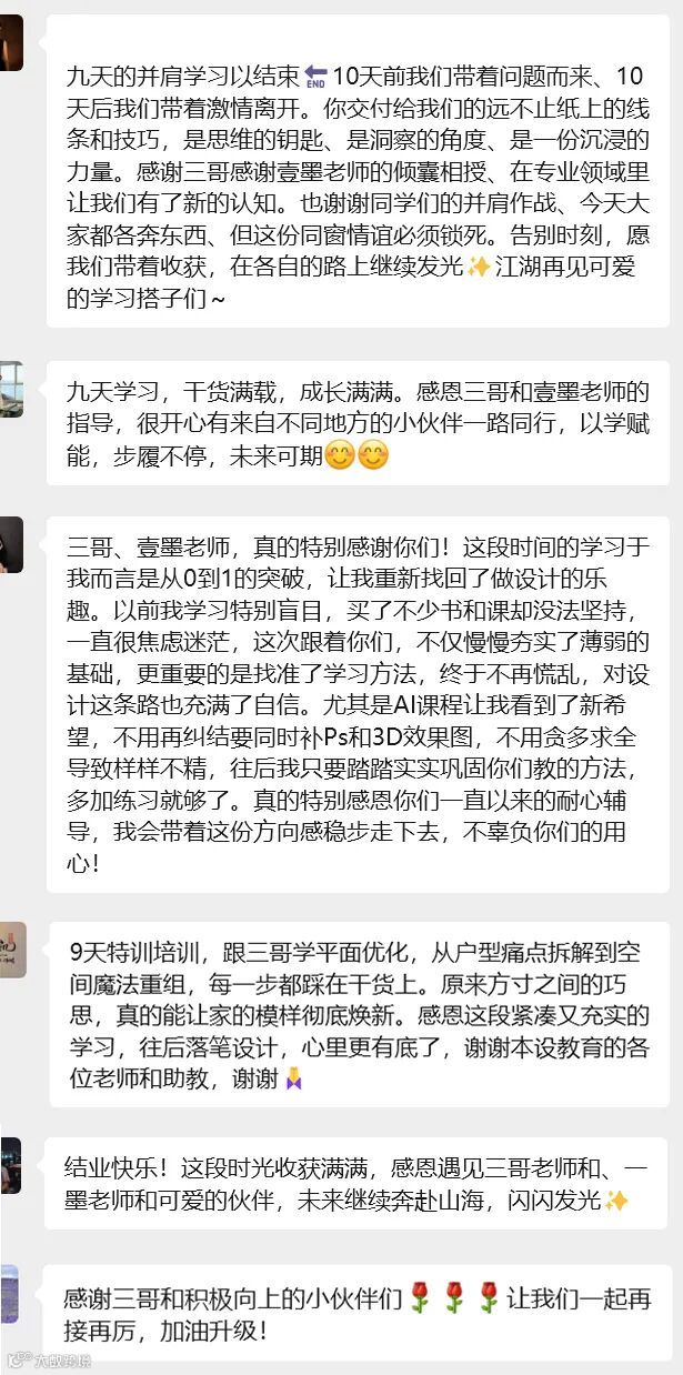 三哥的结业寄语温暖又鼓舞人心:“天下没有不散的筵席,看着大家返程虽有不舍,但更多是期待。愿你们带着所学在设计岗位大胆实践,把想法变成惊艳作品!工作中遇问题随时群里说,我和壹墨老师永远是你们的后盾。祝前程似锦,成为闪闪发光的设计师!”