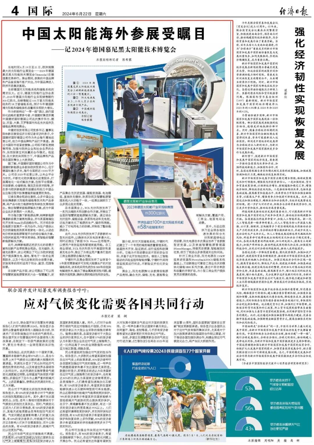 记者在展会现场注意到,众多中国企业纷纷携最新太阳能和储能等技术和产品参展,将产品与助力能源转型和绿色发展相结合。推出智慧家庭能源解决方案,成为中国企业此次参展的一大亮点。(经济日报驻柏林记者 陈希蒙)