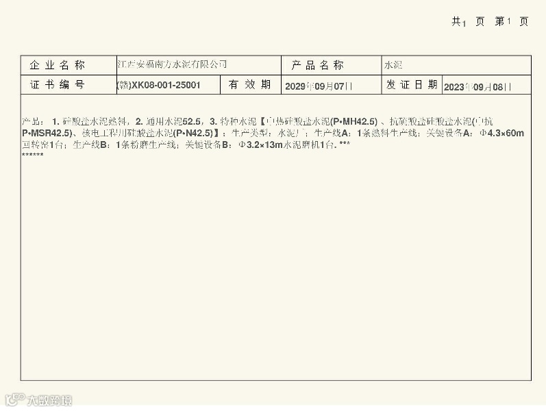 近日,安福南方成功取得P.MSR42.5中抗硫酸硅酸盐水泥和P.N42.5核电工程用硅酸盐水泥产品生产许可证,该新产品是继安福南方取得P.MH42.5中热硅酸盐水泥后新增加的建材产品品类,属全省首家,也是目前江西唯一一家同时具备生产通用水泥、中热水泥、核电水泥、中抗硫酸盐水泥产品的生产企业。
