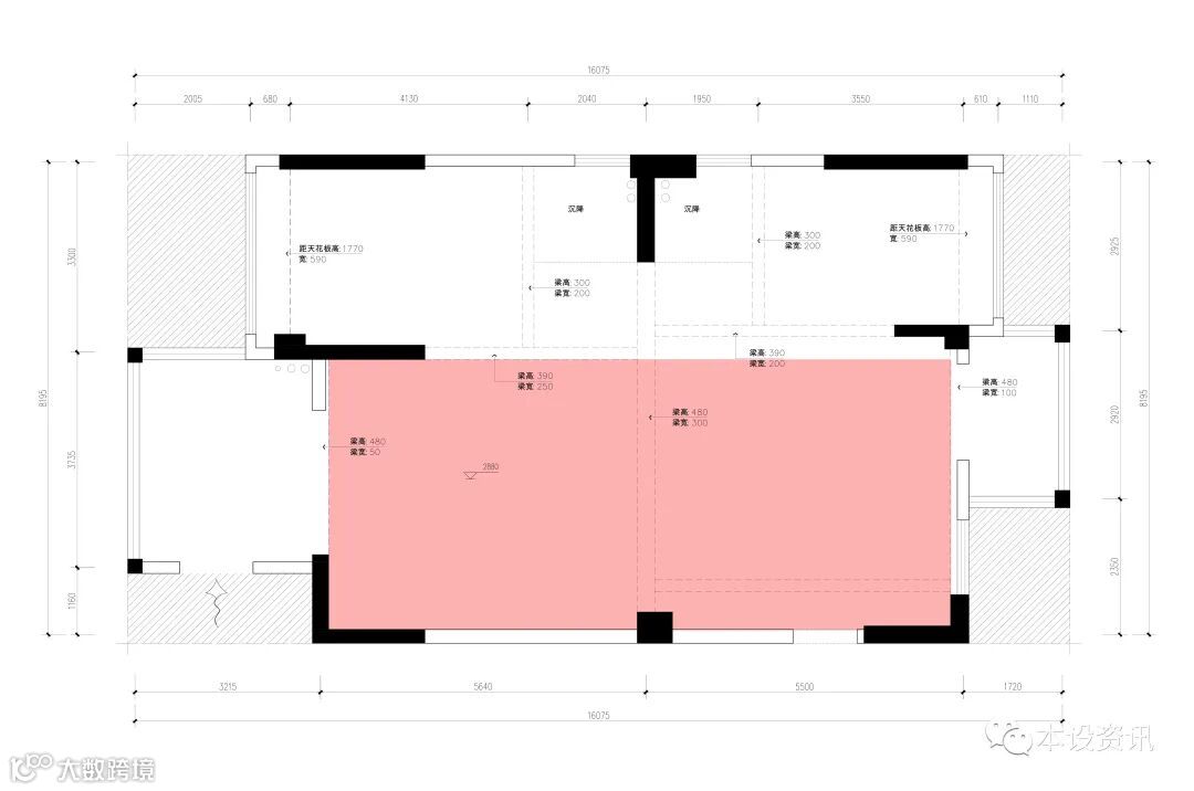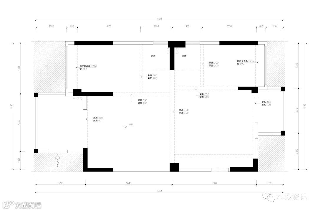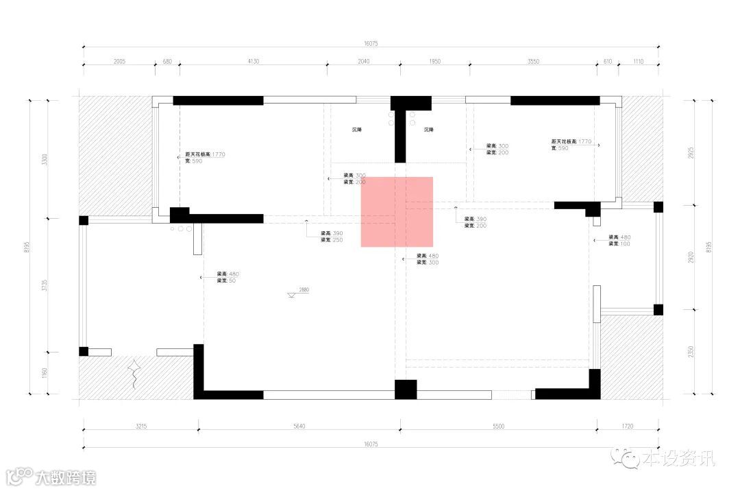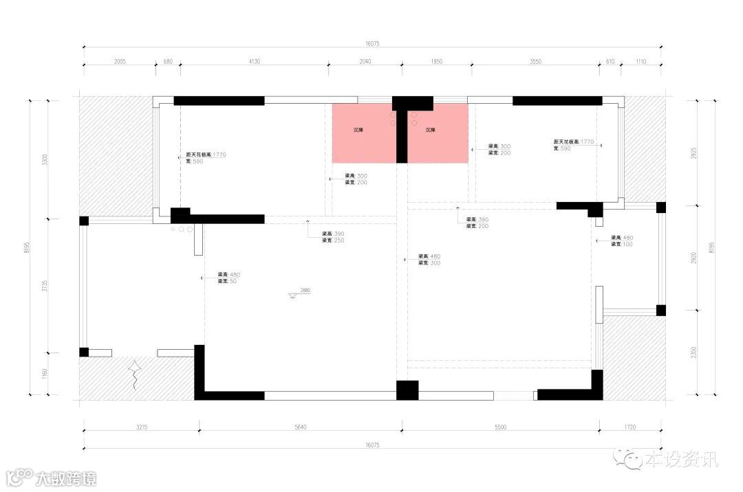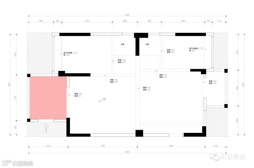 这间套房的原始屋况很特别,整个空间都是开敞的,并没有隔出独立的区域来,只能通过顶上的梁来区分空间格局,不过这样的户型也更有利于设计师的发挥。对于一家三口而言,还是需要先隔出两个独立的卧室区域,以保证业主基本需求,夫妻俩也希望有个独立的书房,能够用来学习、办公和辅导孩子完成家庭作业,所以完善空间功能分区是设计关键。