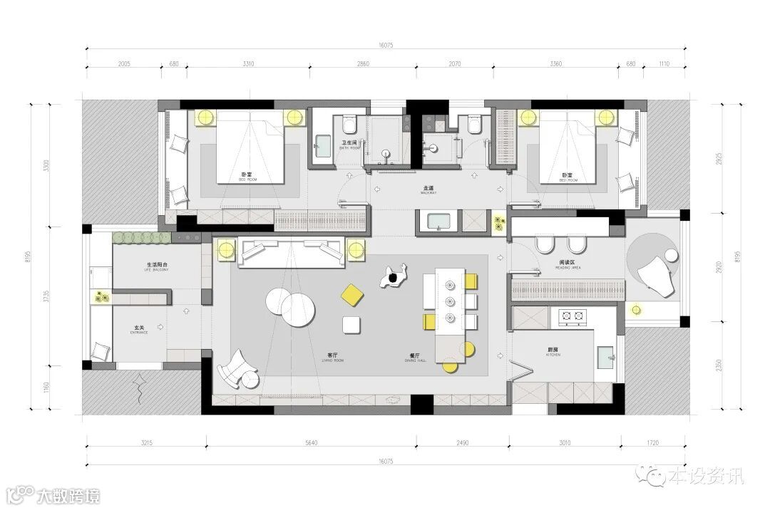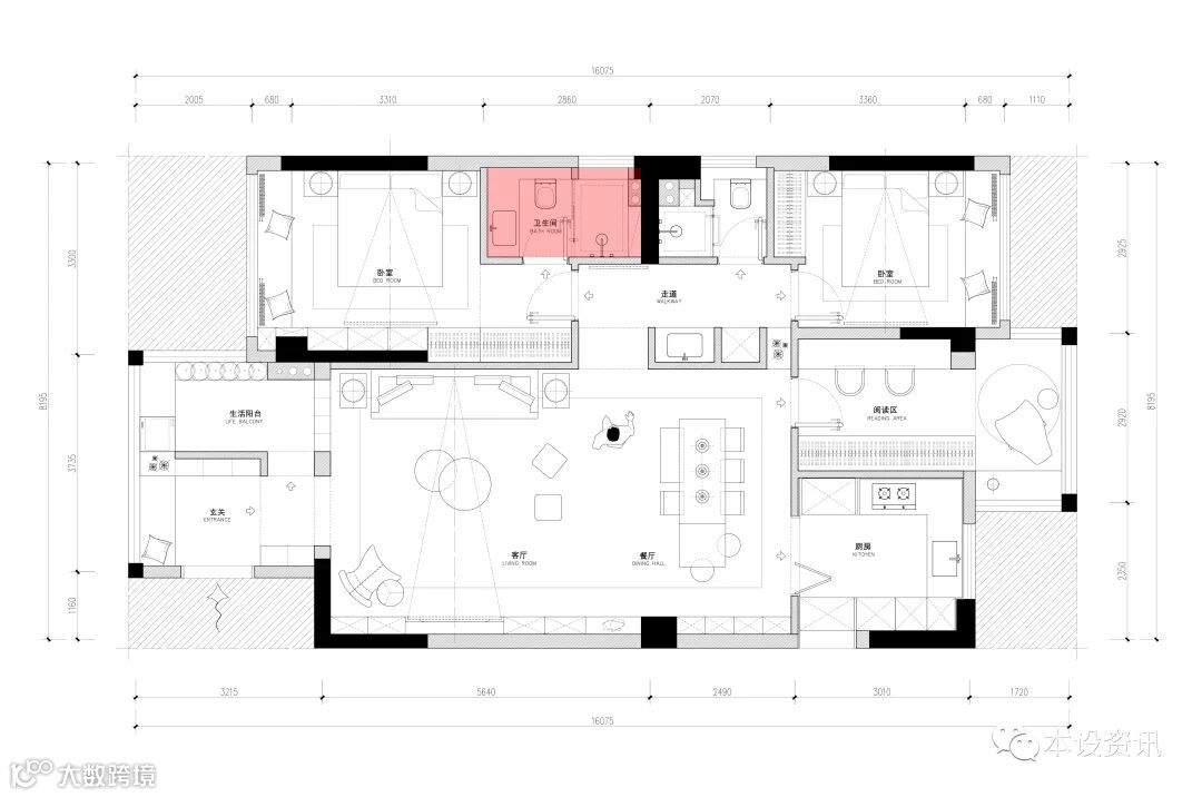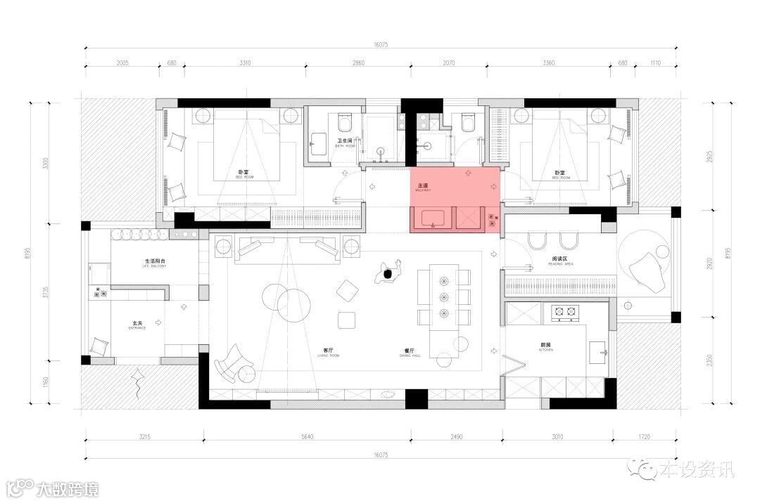 破解二:增加墙体,重新确定空间功能>压缩原有的公共区域,隔出厨房与书房空间,还依然保留一个大大通厅,而且每个区域的使用功能更加明确。