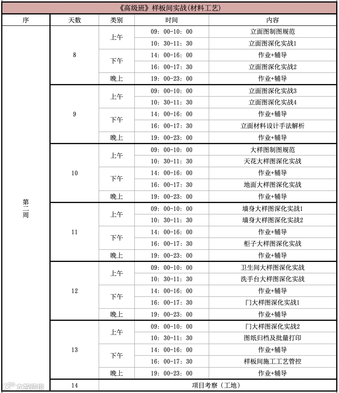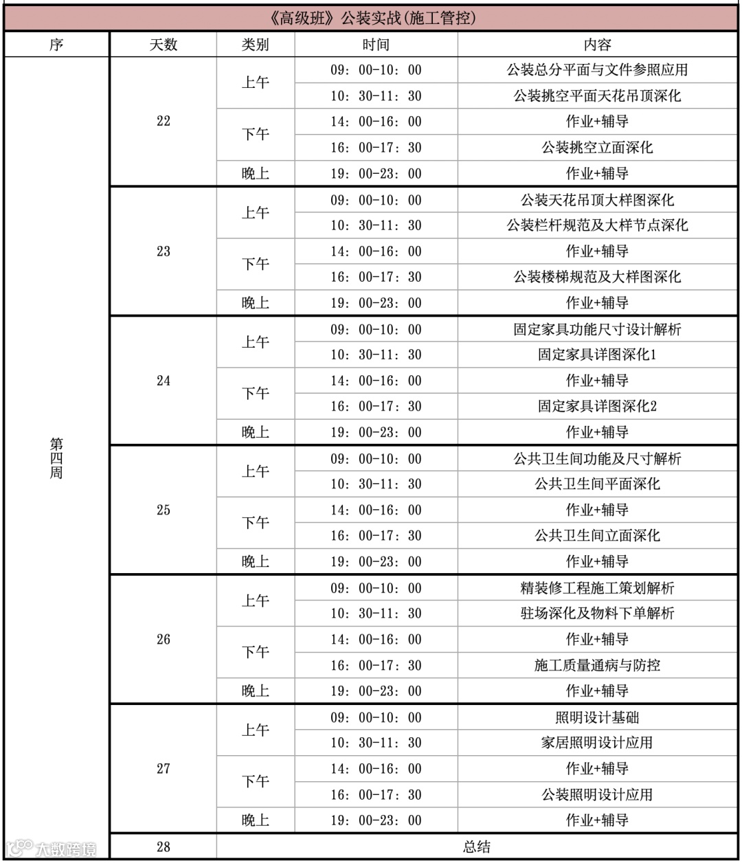 本次集训营共28天,内容涵盖CAD绘图中图层线型布局等基础讲解,同时包括全套国际标准化装饰施工图纸绘制,同时包含装饰材料的分类和收口工艺及定制装饰材料下单,公装空间功能解析及深化细节把控。从新手小白快速逆袭成专业深化设计师,精准把控项目从设计方案到落地效果。