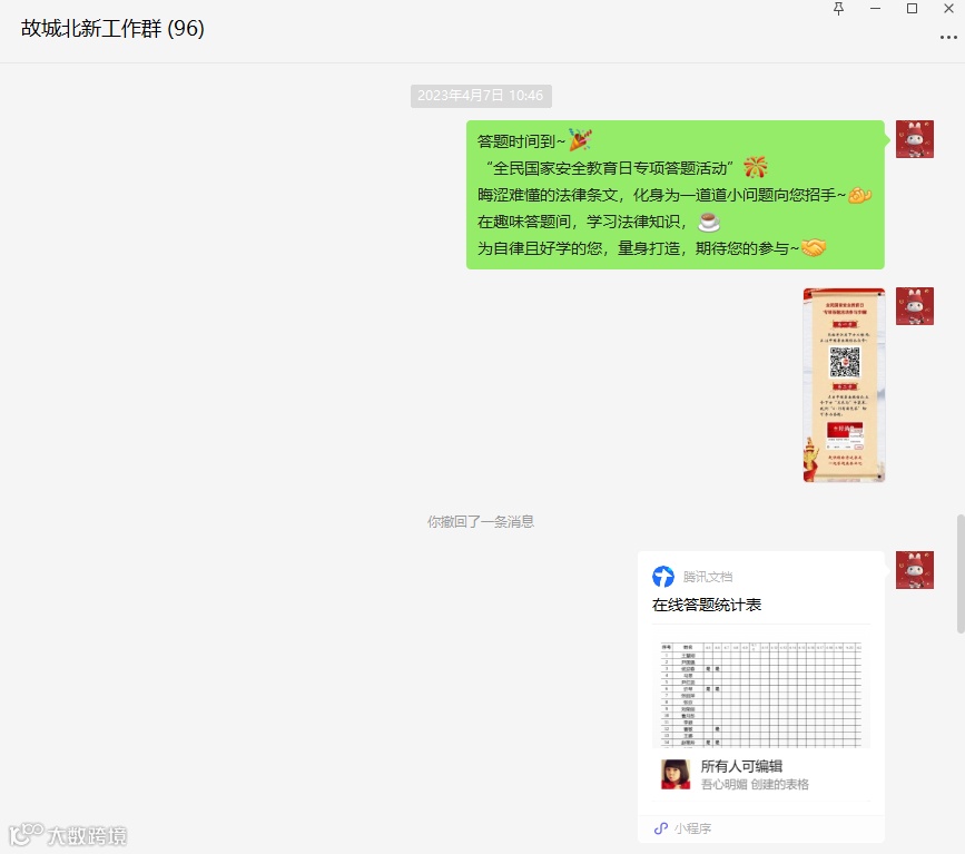 故城北新在办公群内,开展国家安全教育日答题活动,号召大家积极答题。