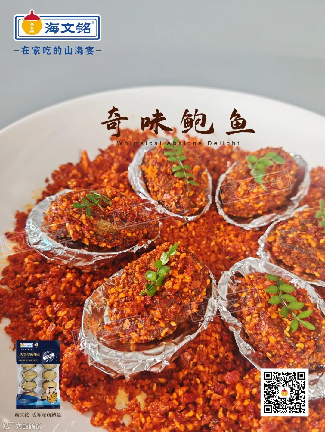 海文铭活冻深海鲍鱼、黄飞鸿脆椒、芝麻、花椒粉、孜然粉、生粉、糖、黑醋、辣鲜露