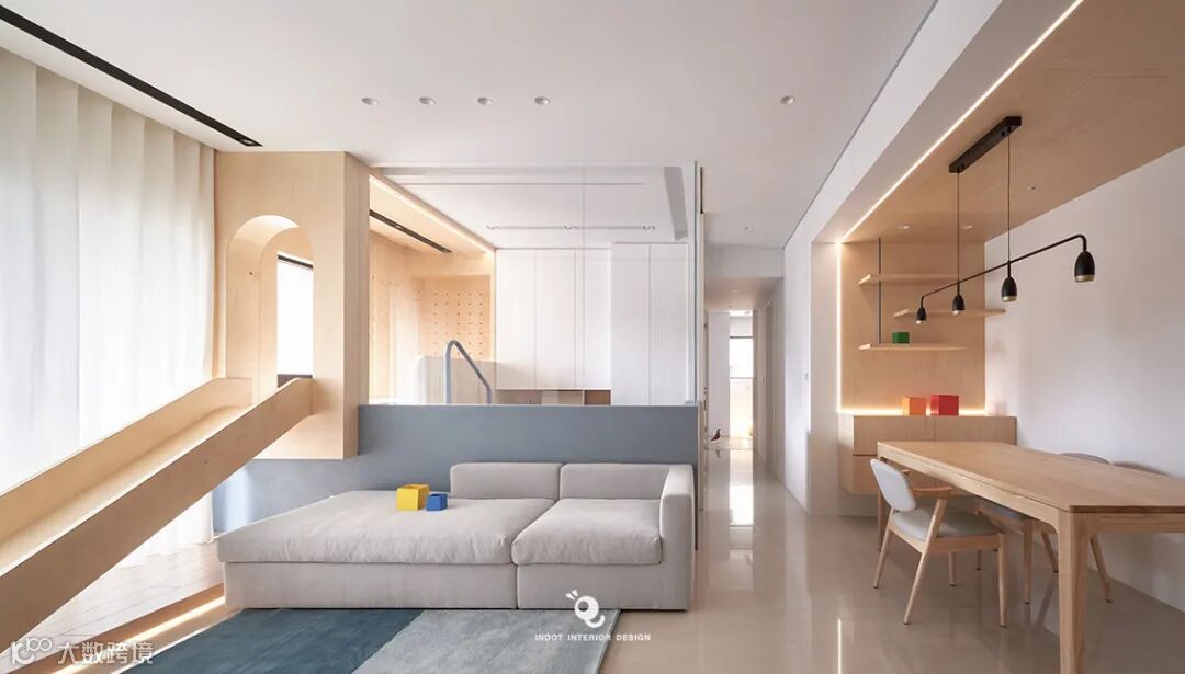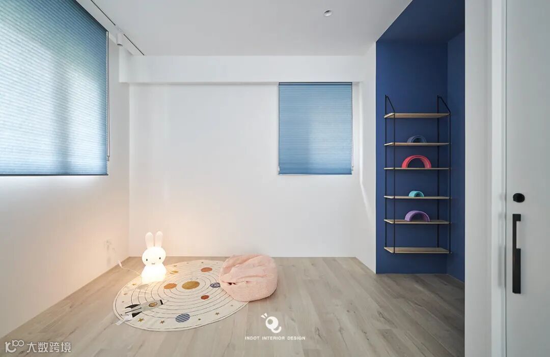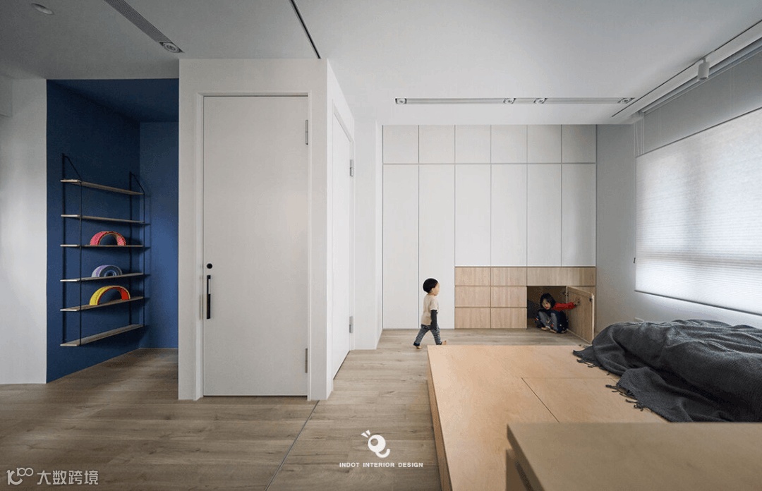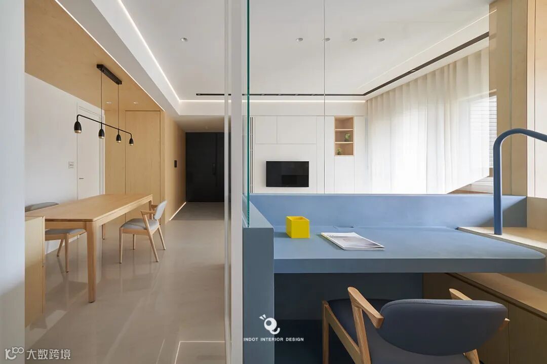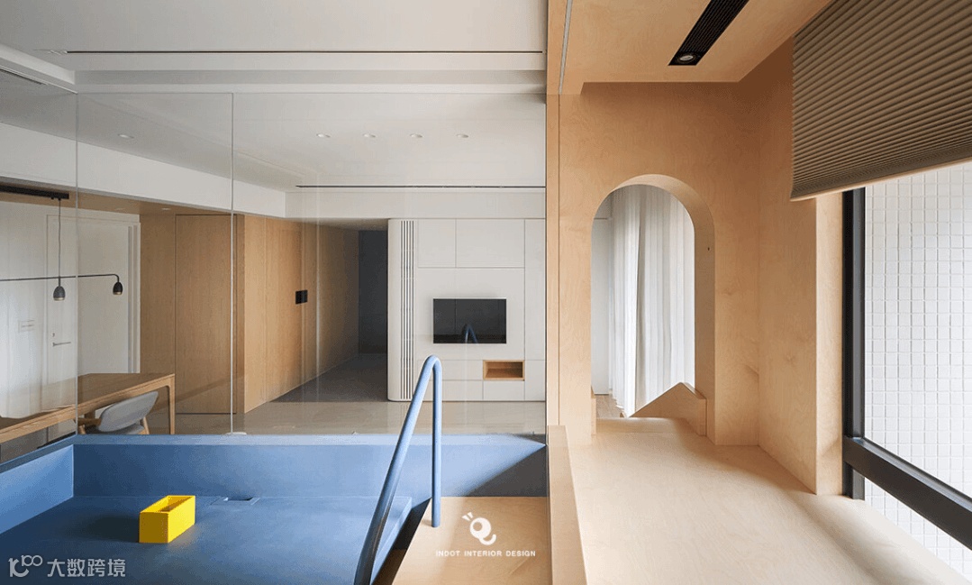 白、蓝、湖水绿色中和木质调的色彩,透过开放或玻璃介质,映衬充裕的採光,让大人与孩子可以在此感受到生活的自在与活动的乐趣。