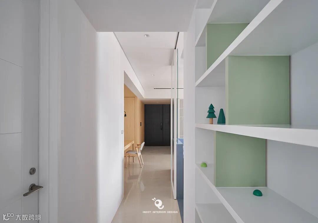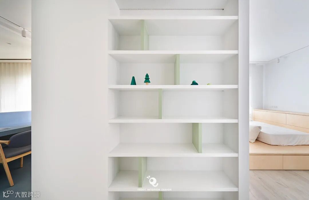 以清爽的绿、白色作为柜体的设计,让动线可以更活泼,收纳机能可以更丰富。