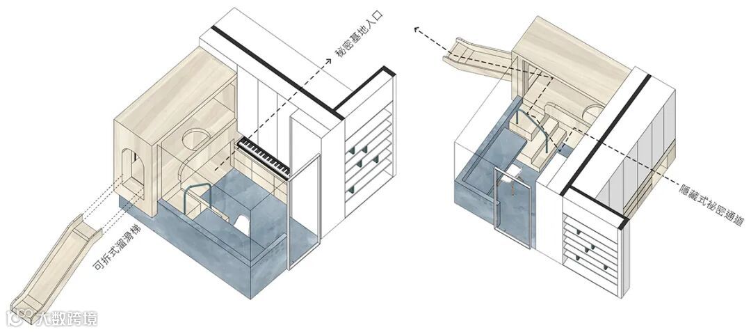 Director Zheng Minghui said: "When I was a child, I liked to use a lot of cartons stacked into a space that can be drilled, we used a lot of cartons stacked into a space that can be drilled, I put the concept of a secret base in such cartons into this space, so that children can explore and create imagination at home."