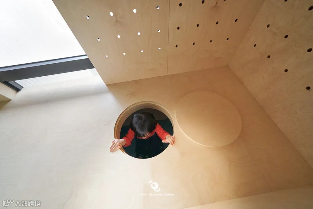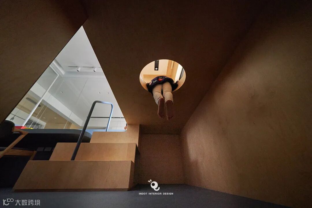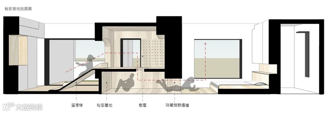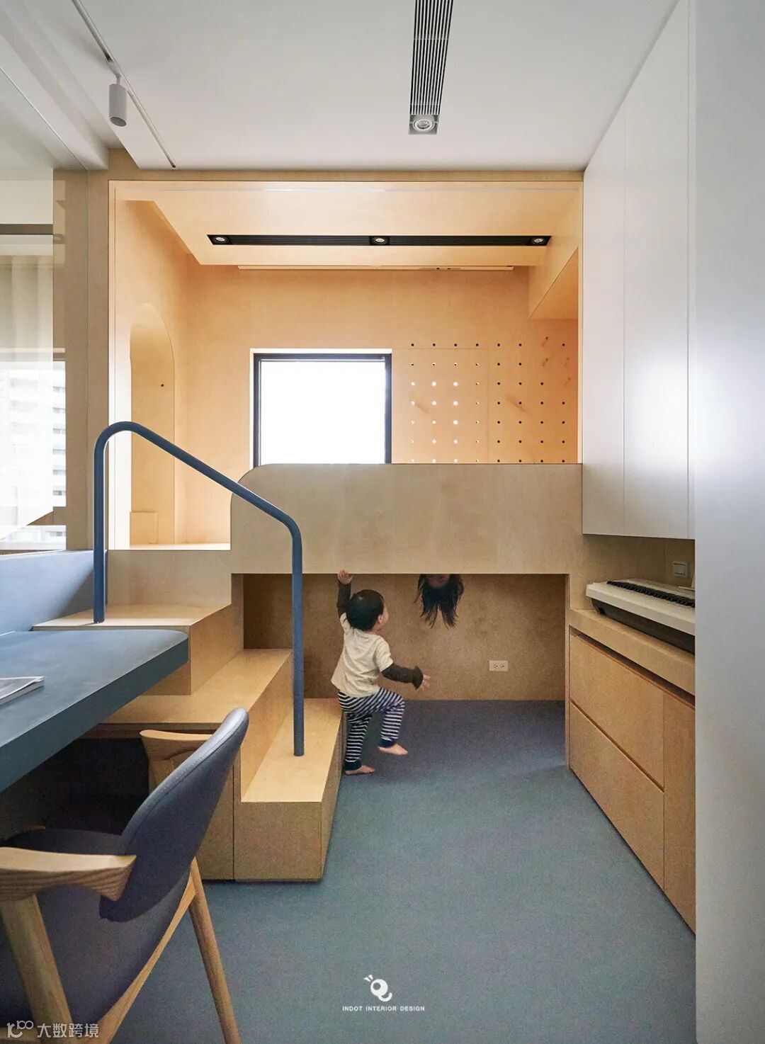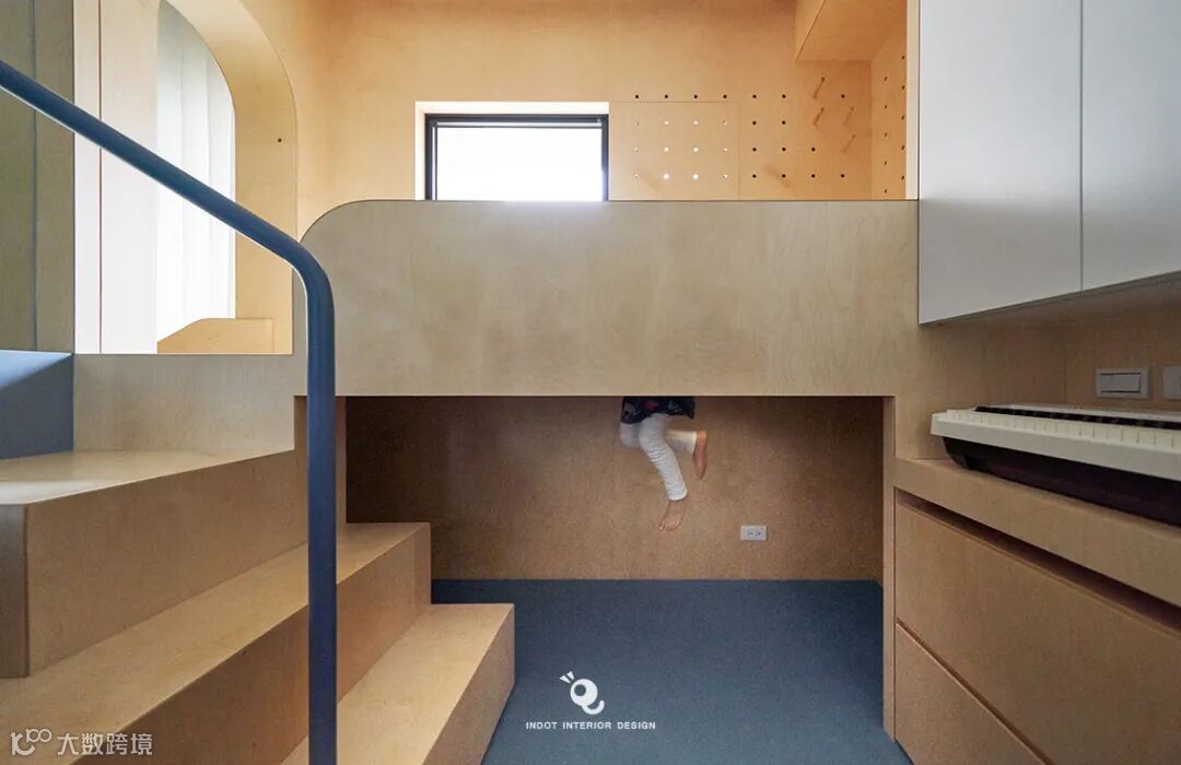 The wood play area is designed with the concept of "tree house". The floor is also dug into a small hole, which can not only climb up and down to hide, but also through the closet from the study. The secret opening to the master bedroom is planned below, so that children can freely shuttle in and out.