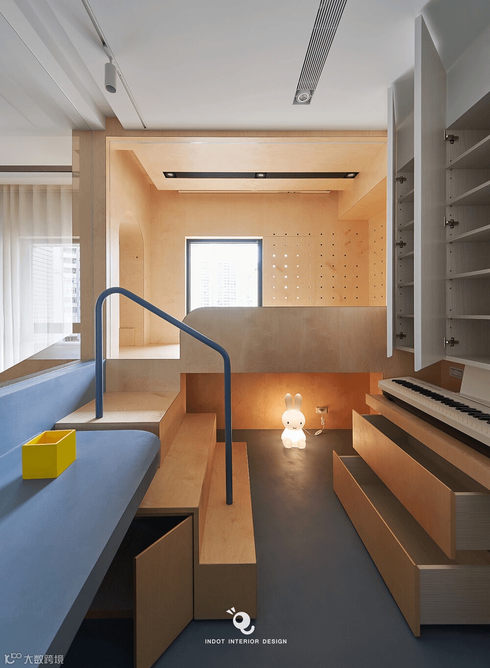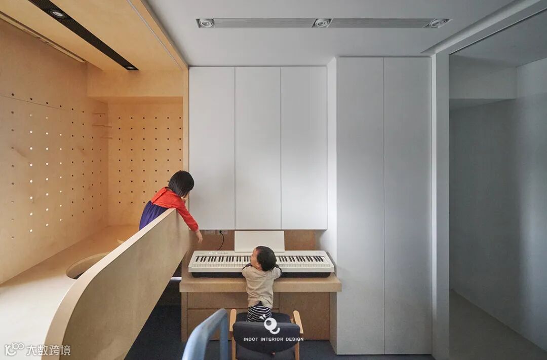 In addition to the rich storage planning, the replacement owner designs a drawing board to reserve the space for the original electronic organ, which can be pulled out for use when necessary. In the children up and down the slide stairs and handrails, or cabinet plywood material, in the corner of the direct grinding design, the surface is also the use of environmental protection and non-toxic paint, in the construction of children's activities in the safety field.