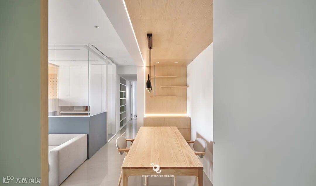 餐厅空间特地将柜体设计延伸至天花,ㄇ字型的框架,界定客、餐厅间彼此开放属性,一旁矮柜设计餐具柜使用,灯带的效果,也间接营造出轻盈的餐叙氛围与轻鬆感受。