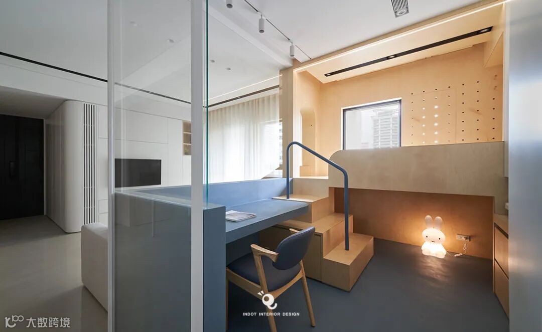 In the study area, gray blue paint is boldly used on the floor, desk and wall, and the concept of translucent and wooden box is designed. It is the space for families to read, the place for couples to work, and the place for children to play with the tree house, secret base and slide.