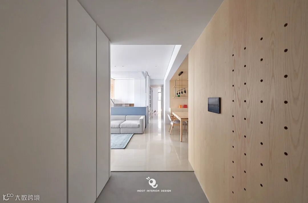 设计规划上,于玄关处安排落尘区,右侧以实木夹板设计洞洞牆,利用错落层次,可挂外出衣物或一些生活小物的装饰;左侧为大面鞋柜,柜内刻意预留放置消毒设备、以及规划放置外出回家要换洗衣物的空间,满足进出消毒及清洁的措施。