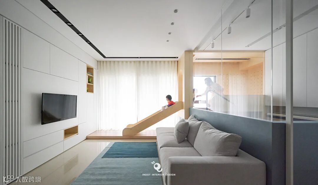 将原始格局中客厅旁的房间隔间牆拆除,利用清玻材质作为区域中介,规划为书房并结合游戏功能,并以树屋为概念,设计串联书房与客厅的溜滑梯;再考虑到孩子未来长大,玩滑梯的时间变少了,特地将溜滑梯以卡榫装置设计,方便拆卸。
