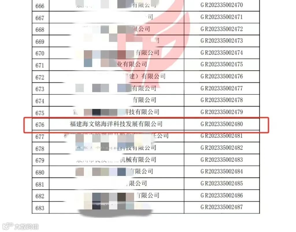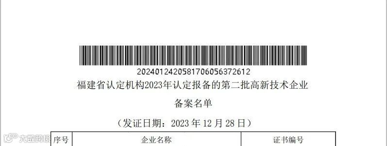 1月24日全国高新技术企业认定管理工作领导小组办公室公布了《福建省认定机构2023年认定报备的第二批高新技术企业备案名单》,福建海文铭海洋科技发展有限公司成功上榜,获批“高新技术企业”认定,正式迈入国家高新技术企业行列。