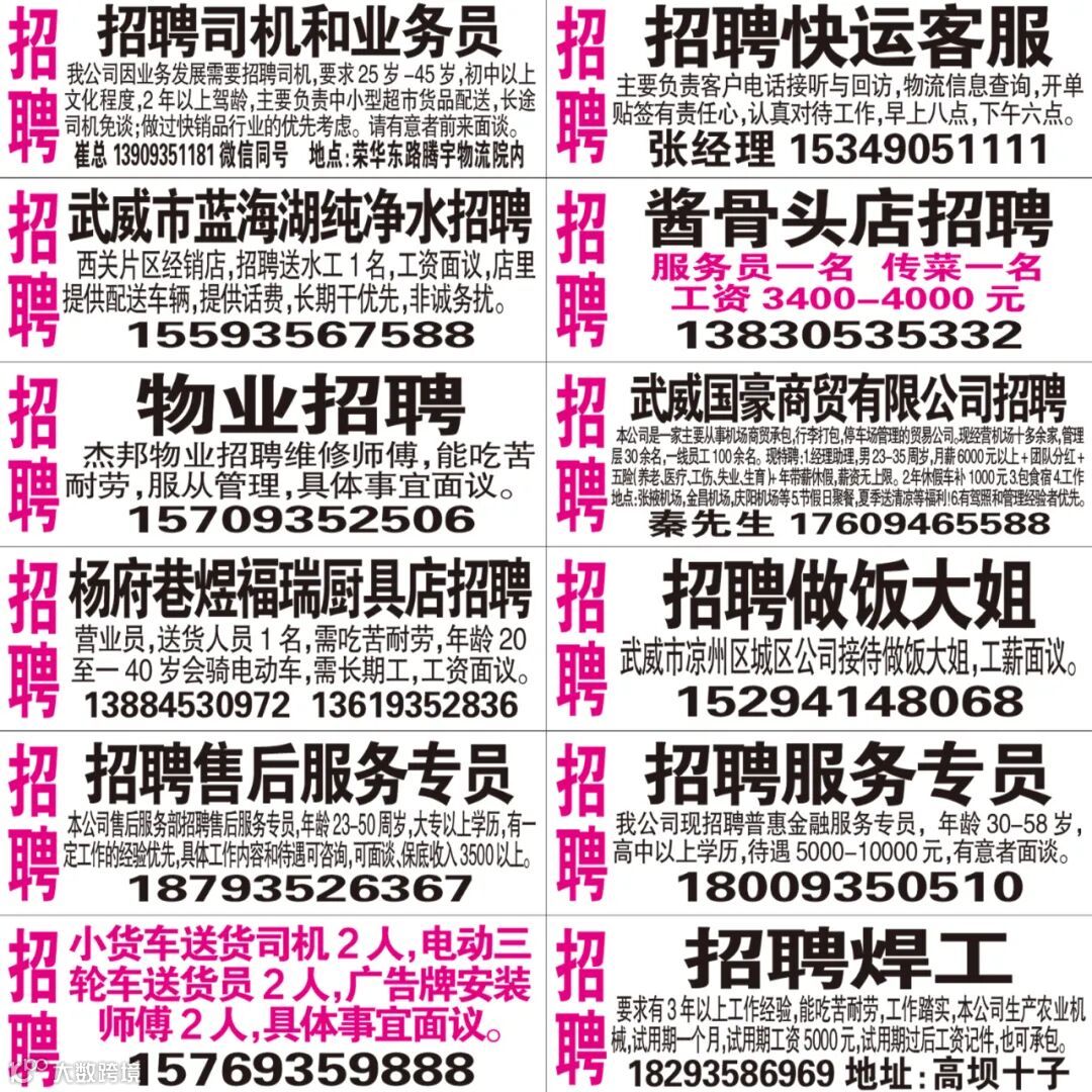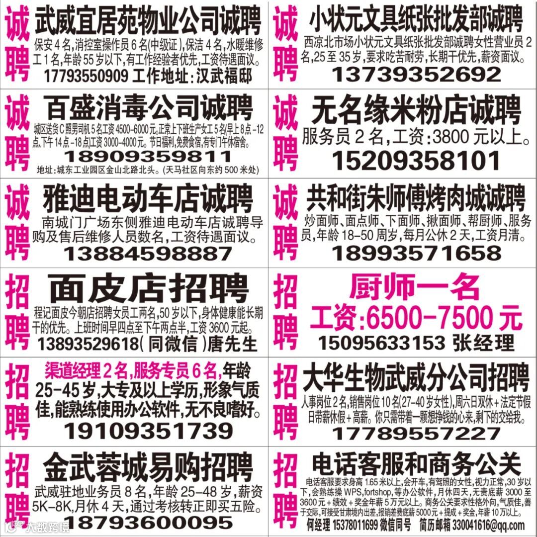 武威红柳广告和武威视觉传媒有限公司倾力打造武威本地网上生活平台,给您更好的本地资讯。招聘、求职、出租、转让、二手交易等便民信息查找、发布,商家优惠,吃喝玩乐购全都有。