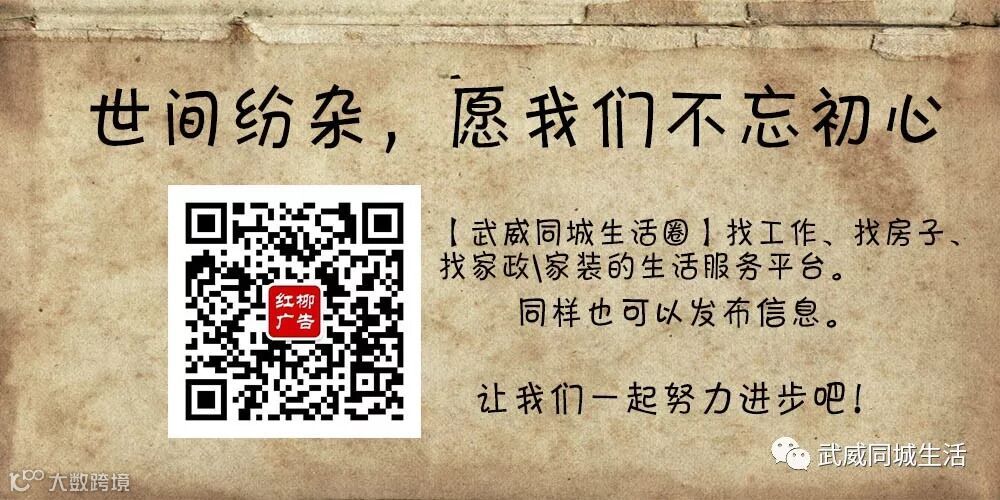 ☀ 定期推送武威同城活动,居家房产,热点资讯,商家优惠等诸多分类优质信息,武威最接地气、重服务的本地微信平台!关注我们妥妥没错!(广告热线:0935- 6964699)