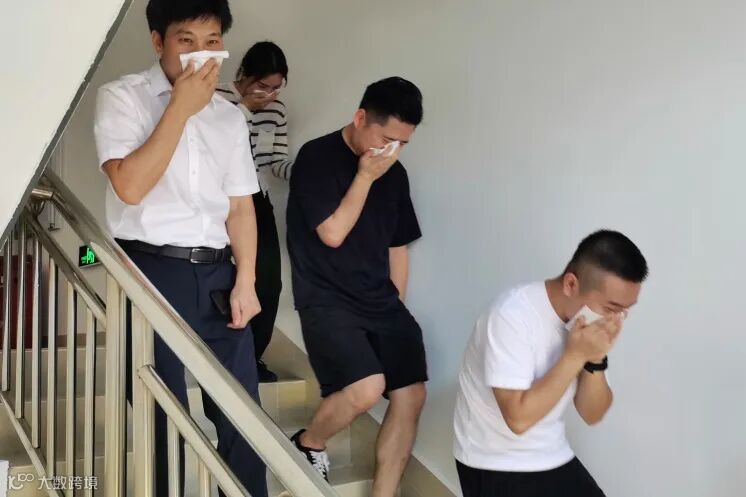 理论培训结束后,厂区内“浓烟”开始蔓延,一场实战化逃生演练紧张上演。演练活动模拟厂区内火灾事故,紧急启动生产安全事故应急预案。项目部总指挥拨打火警电话119,并指挥人员和物资做好疏散转移工作。