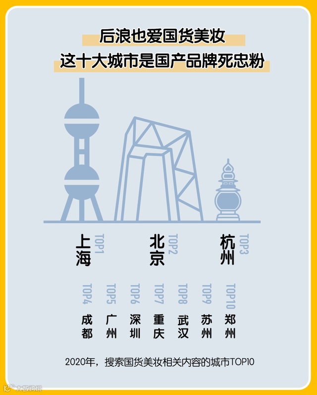 数据显示,上海、北京、杭州对国货美妆最感兴趣,位于十三朝古都的西安妹子则最关注“古风仿妆”,领跑北京、上海、广东、江苏等城市。