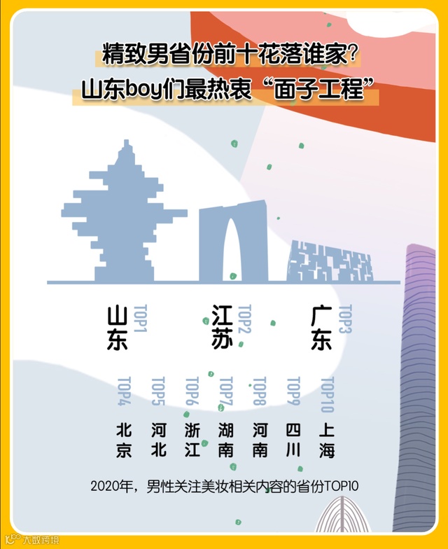 男性也越来越注重护肤和美妆,据数据显示,山东地区的男性在这方面花不少功夫,其次呢,江苏、广东、北京、河北男性也不甘落后,跻身最热搜美妆相关内容的Top10城市。