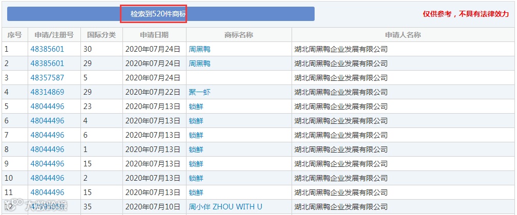 截至目前商标局官网显示,湖北周黑鸭企业发展有限公司申请商标共计520件,并且还对这个商标进行了全行业的注册保护,可见周黑鸭在商标战略布局方面的意识还是很强的。