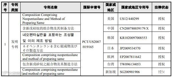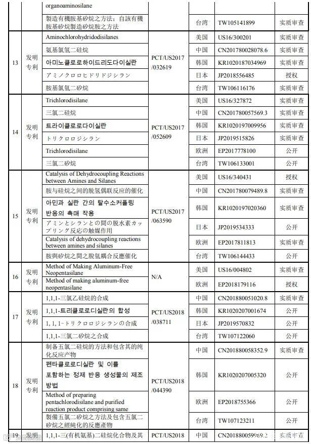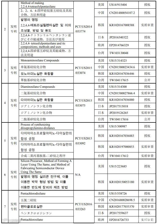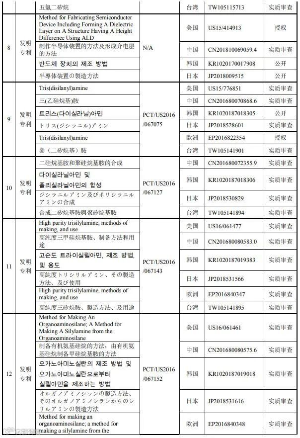 南大光电本次拟购买的19项专利资产组,涵盖近10个新型硅前驱体的化学成分、合成/生产工艺和应用,在全球主要芯片制造国家和地区适用。这些高性能硅前驱体可通过化学气相沉积或原子层沉积生成新型半导体所需要的特种含硅薄膜,可以满足高性能计算和低功耗需求的高级逻辑和存储器芯片制造要求,应用领域主要有电脑、手机芯片等。标的专利资产清单如下表(不包括6项正在受理尚未公开的专利申请):