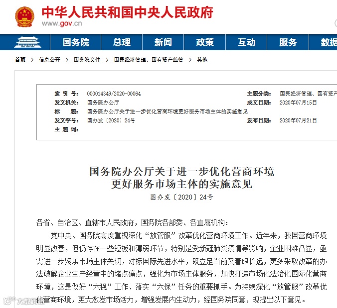 党中央、国务院高度重视深化“放管服”改革优化营商环境工作。近年来,我国营商环境明显改善,但仍存在一些短板和薄弱环节,特别是受新冠肺炎疫情等影响,企业困难凸显,亟需进一步聚焦市场主体关切,对标国际先进水平,既立足当前又着眼长远,更多采取改革的办法破解企业生产经营中的堵点痛点,强化为市场主体服务,加快打造市场化法治化国际化营商环境,这是做好“六稳”工作、落实“六保”任务的重要抓手。为持续深化“放管服”改革优化营商环境,更大激发市场活力,增强发展内生动力,经国务院同意,现提出以下意见。