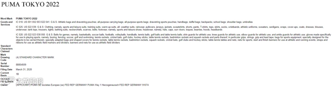 不仅是“Puma Tokyo 2021”商标,彪马此前还曾将“Puma Tokyo 2022”注册为商标。这两件均用于服装、鞋类、配饰和和体育用品等商品上。