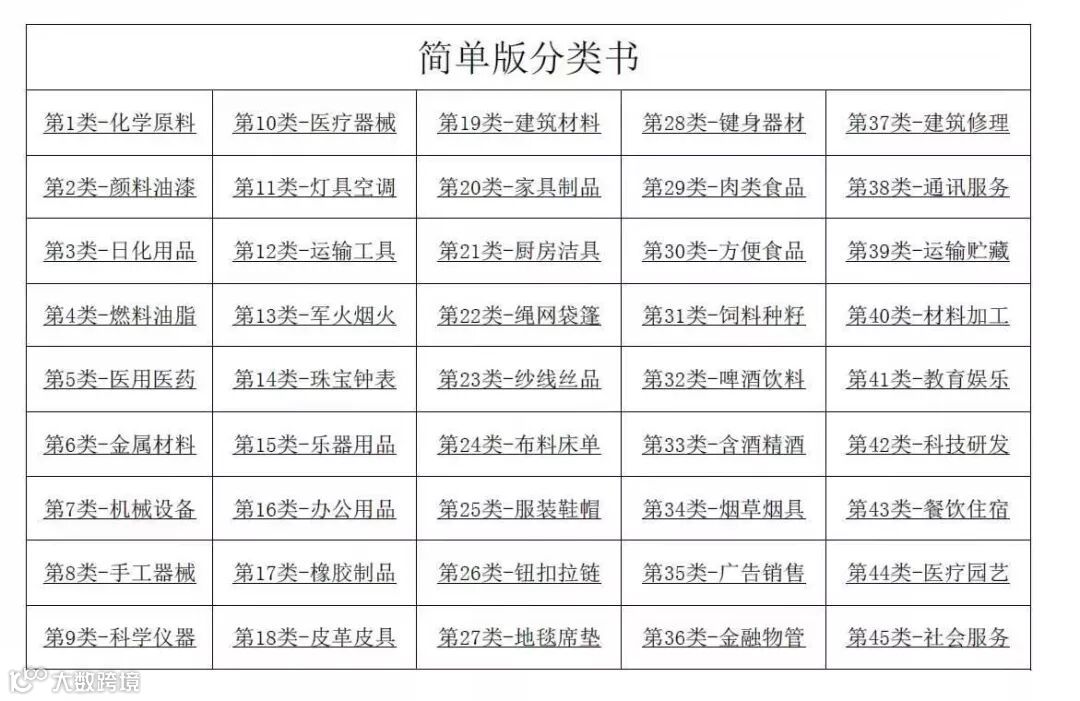 商标类别指的是所要注册的商标所属的行业,我国采用尼斯商品分类,商标注册用商品和服务分类表共分为45类,指向特定的产品与服务,其中1-34是商品类别,35-45是服务类别。商标分类后可便于检索、管理、审查。