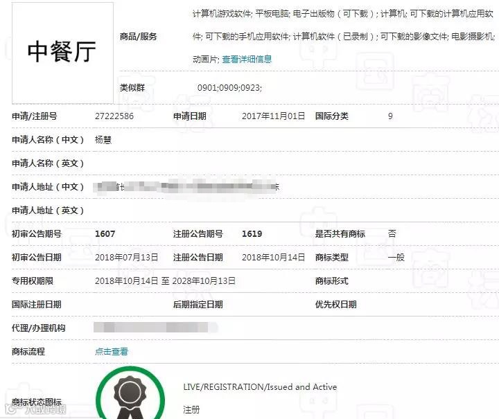将“中餐厅”商标去掉了“CHINESERESTAURANT二零一七”的字样,这才成功注册了第九类的商标。