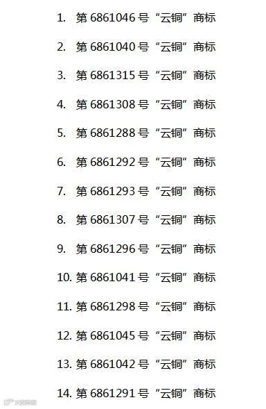 截至2020年5月31日,以“云铜”作为商标名称进行检索,结果显示有200件商标注册申请与云铜文字相同或近似。