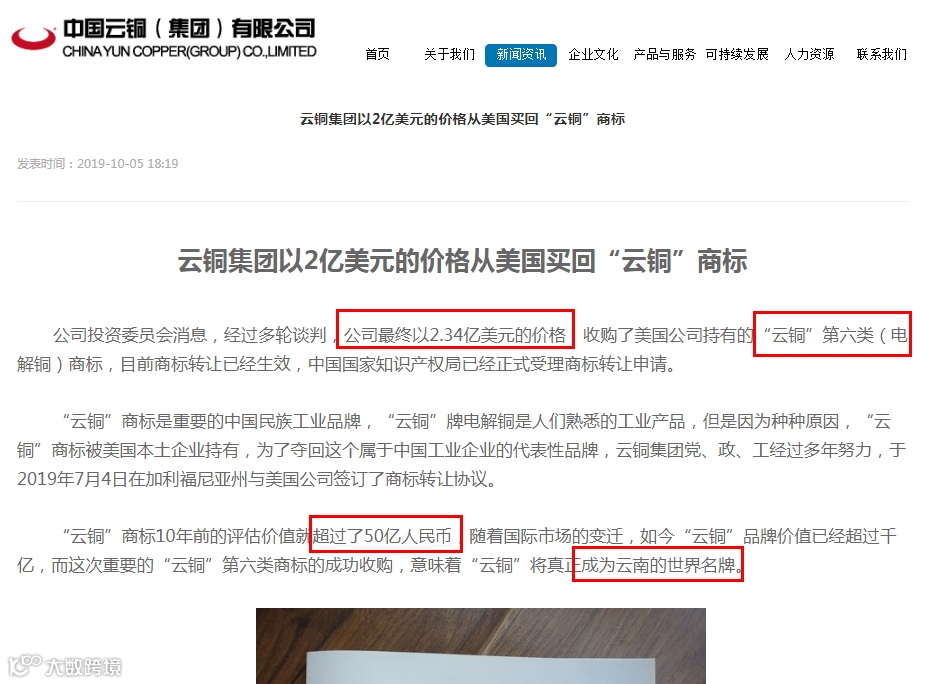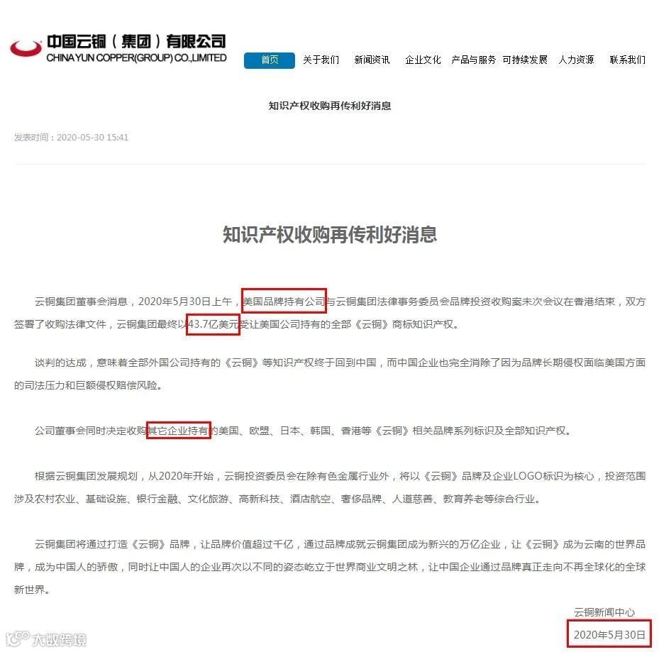 第二条信息:2020年5月30日,公司以43.7亿美元受让美国公司持有的全部“云铜”商标。