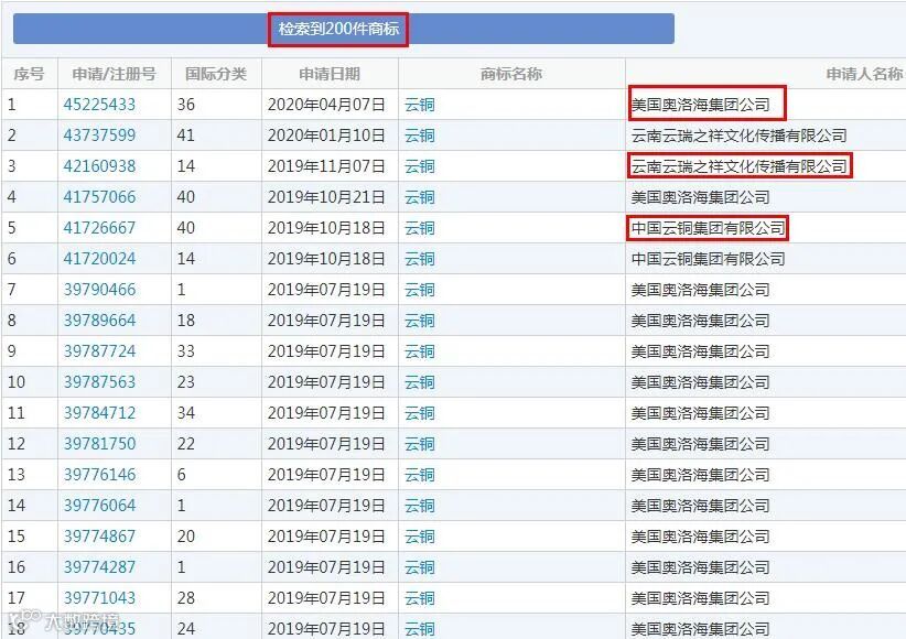 其中,196件注册商标为云南云瑞之祥文化传播有限公司、美国奥洛海集团公司、中国云铜集团有限公司三家公司包揽。